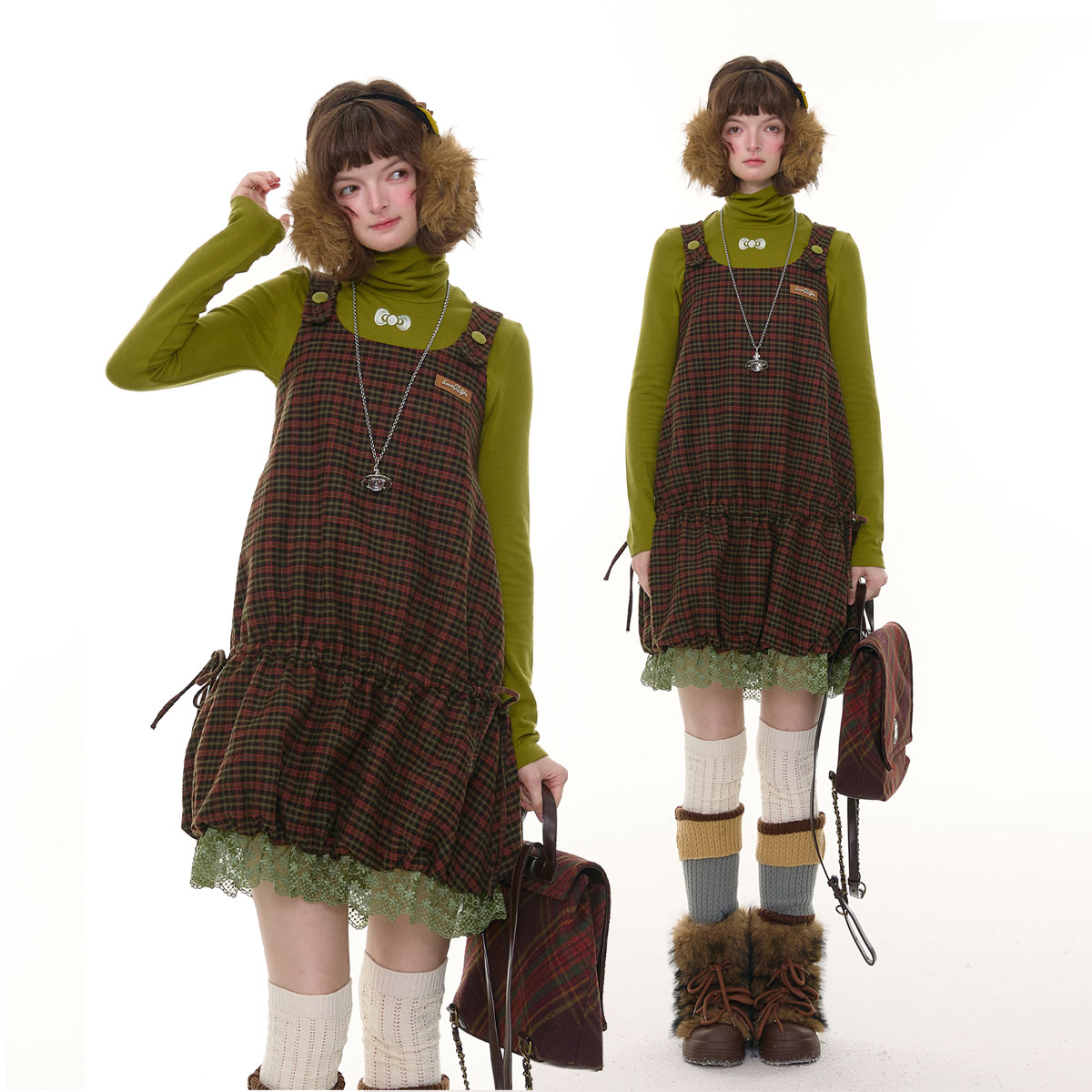 ziziFei秋冬季美式复古新款设计感红色格纹蕾丝下摆背心连衣裙女