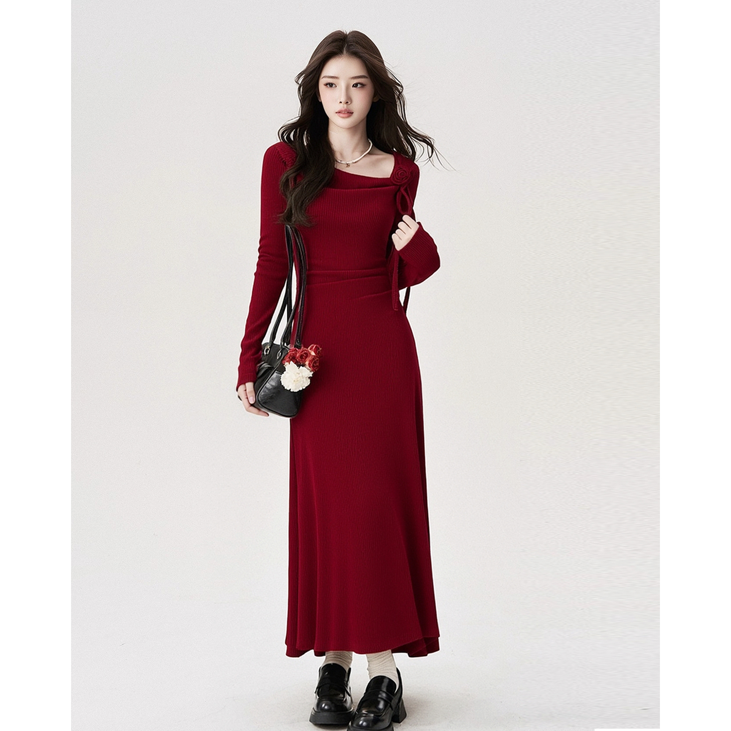 唐狮冬季红色连衣裙秋冬新年战袍针织中长款毛衣裙女装过年穿搭y3