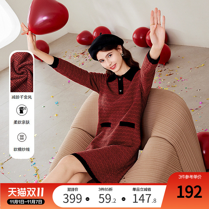 betu百图女装2025年冬季新款新年红色撞色宽松显瘦Polo领连衣裙