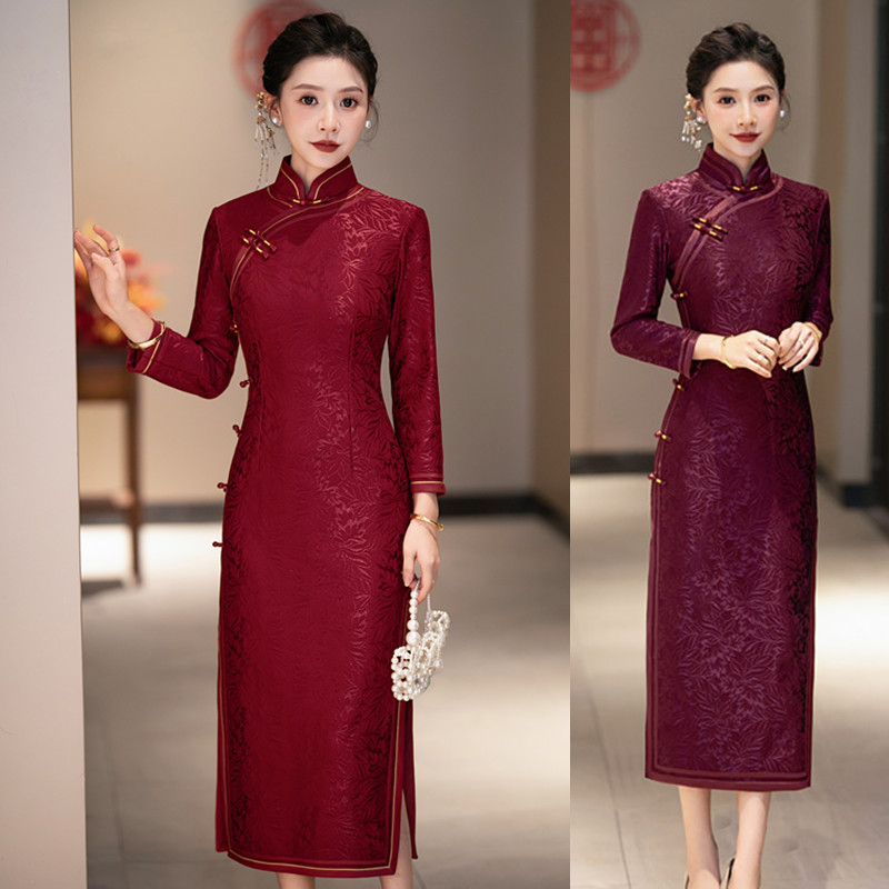 中长红色旗袍女冬季老上海改良复古优雅民国连衣裙日常加厚生活装