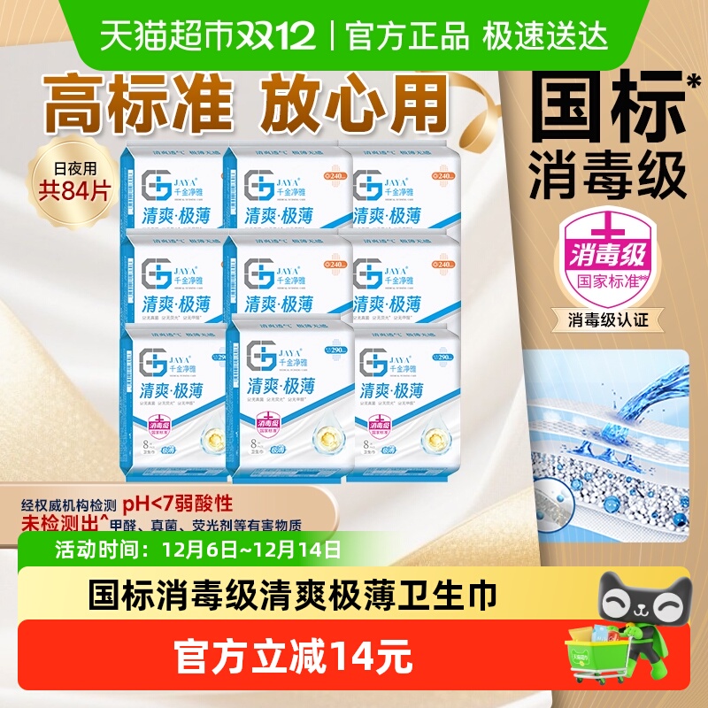 千金净雅卫生巾清爽极薄日用240夜用290超舒睡360和420姨妈巾促销