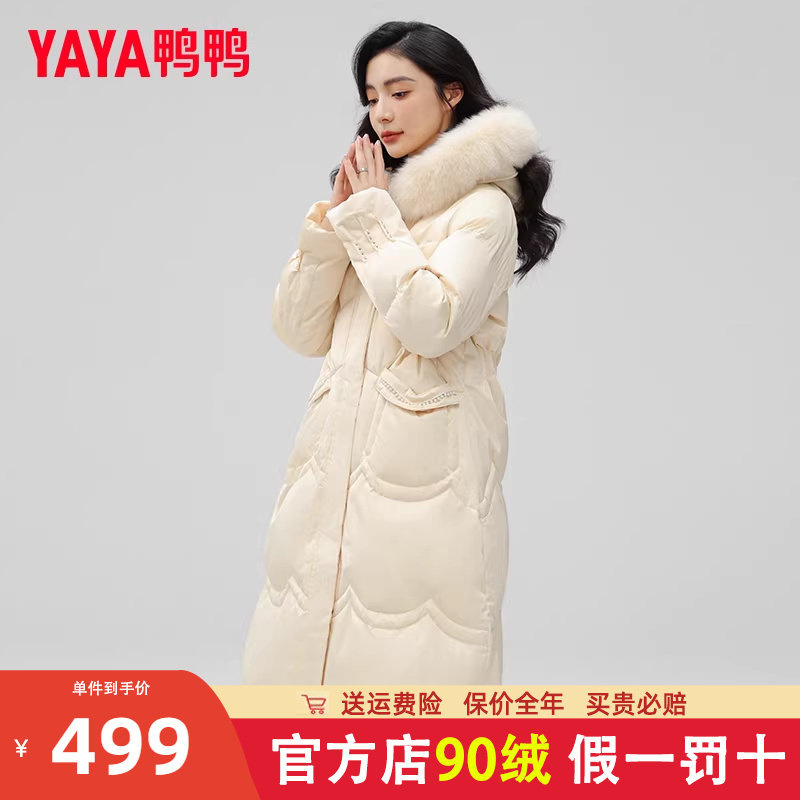 YAYA鸭鸭白色羽绒服女2025冬季时尚大毛领长款过膝保暖加厚外套女