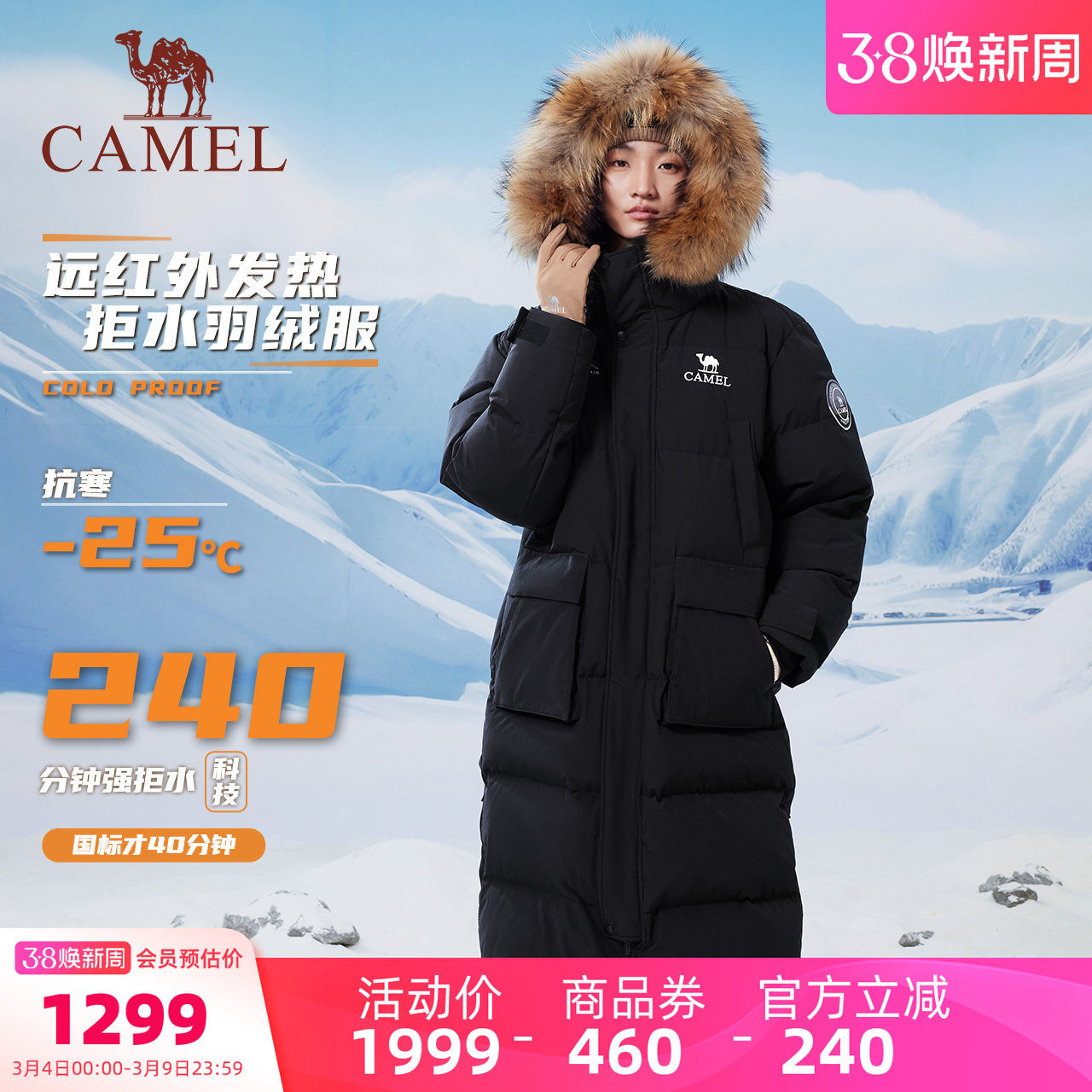 骆驼女装羽绒服长款过膝冬季2025防风保暖大毛领连帽羽绒外套