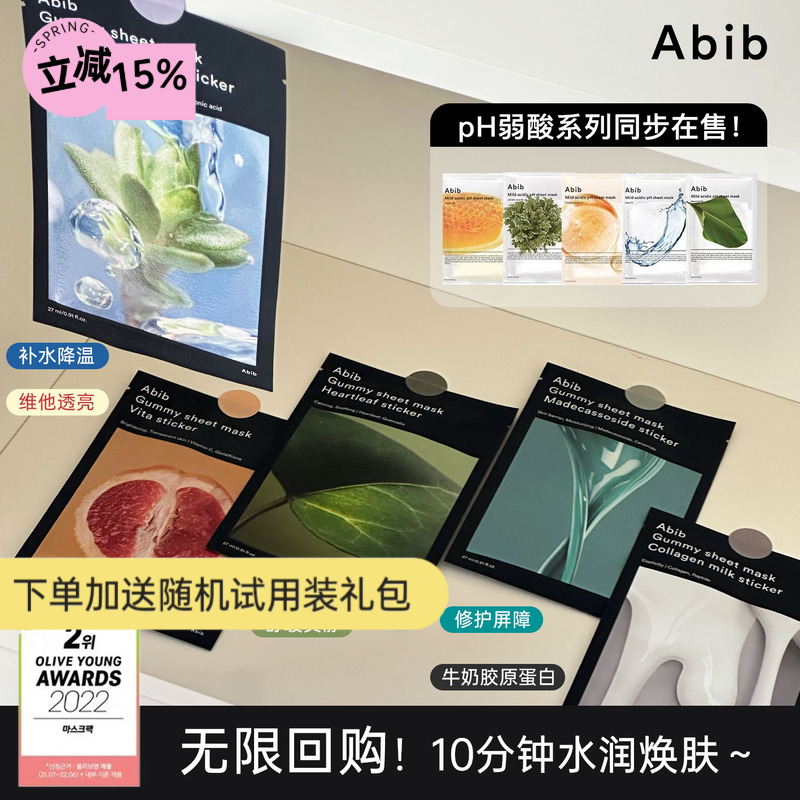 韩国abib阿彼芙弱酸性面膜口香糖鱼腥草积雪草水库补水维稳贴片
