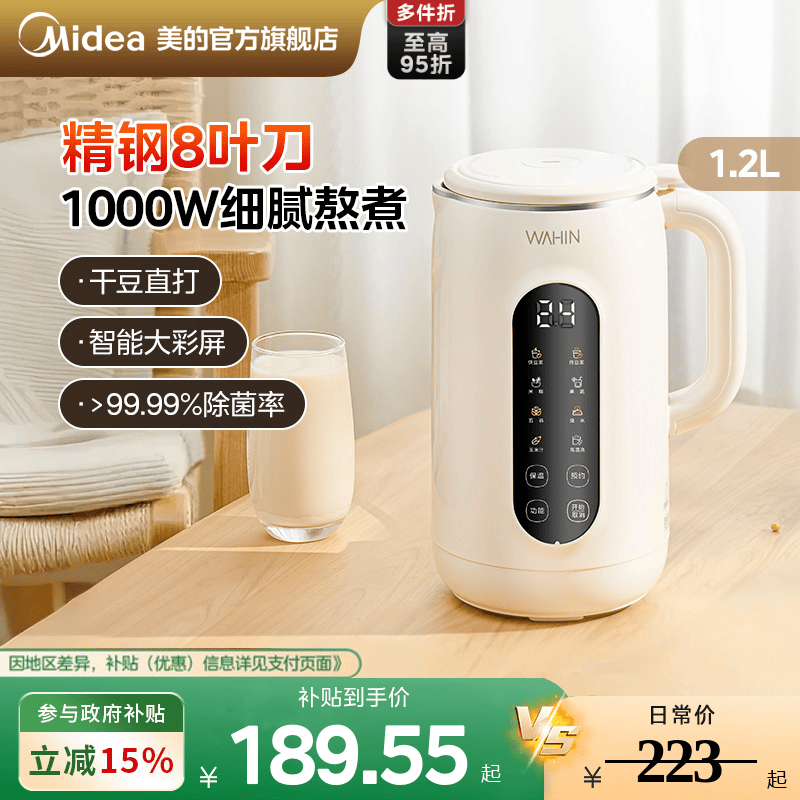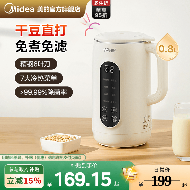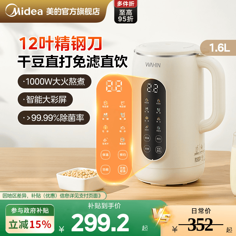 美的出品华凌家用豆浆机全自动免过滤无渣轻音破壁1-3人官方正品