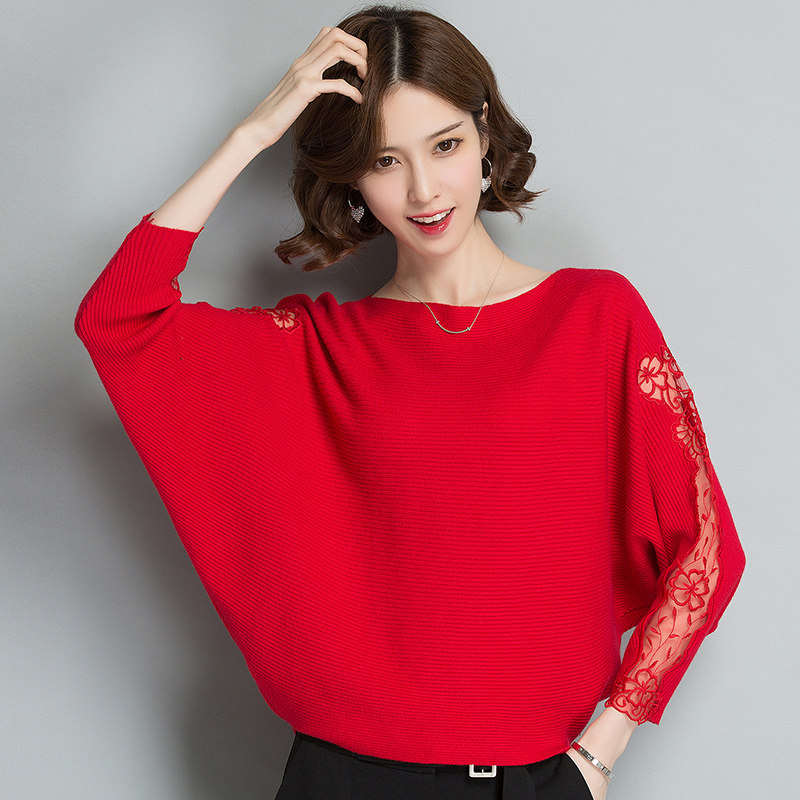 本命年大红色毛衣蝙蝠袖羊毛衫T恤女蕾丝绣花韩版宽松针织上衣秋
