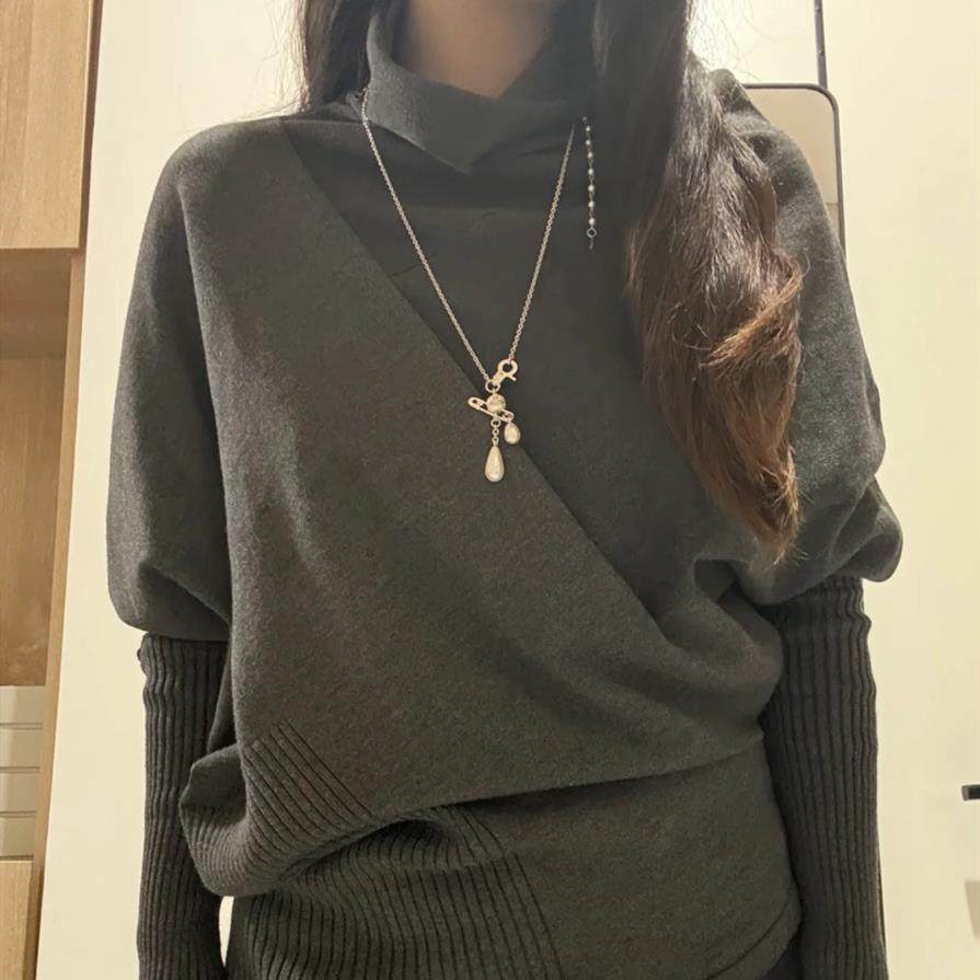 秋冬季新款韩版高领短款不规则设计感交叉毛衣宽松针织衫女蝙蝠衫