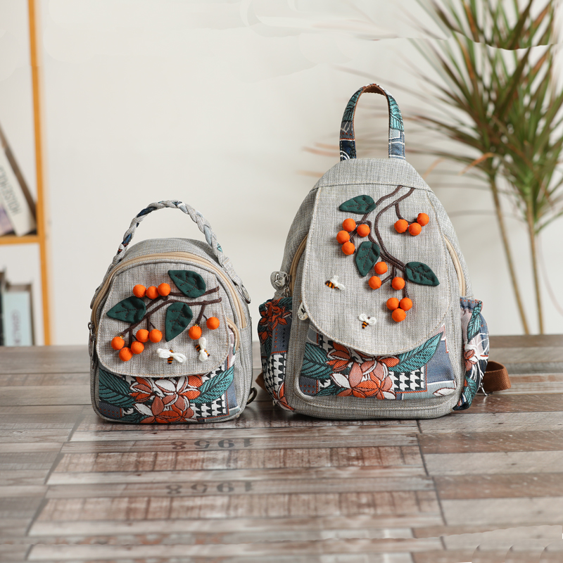 帆布轻便休闲双肩包文艺多隔层斜挎立体手工编织柿柿如意轻便背包