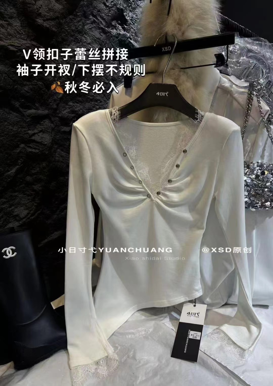 小众设计性感V领蕾丝花边上衣修身辣妹长袖t恤内搭打底衫女秋冬季
