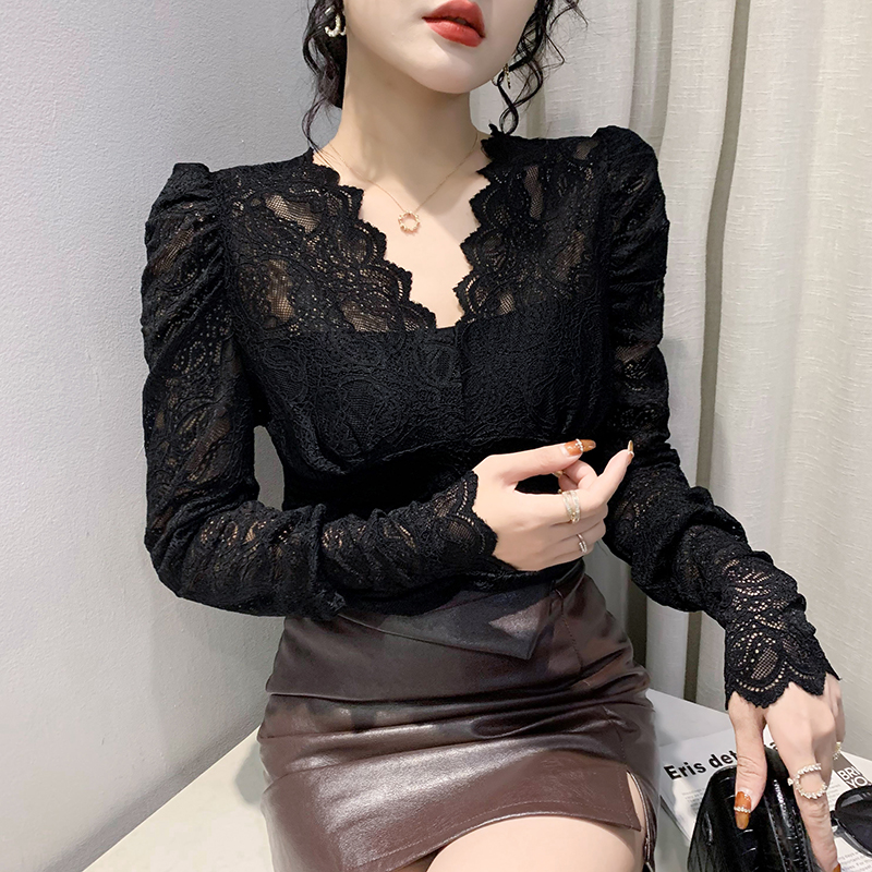 性感镂空V领蕾丝打底衫女长袖秋冬欧货时尚泡泡袖上衣洋气质小衫