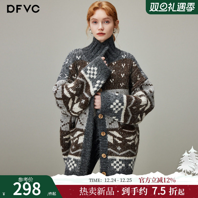 dfvc复古费尔岛提花针织开衫女2025年冬季新款宽松中长款毛衣外套