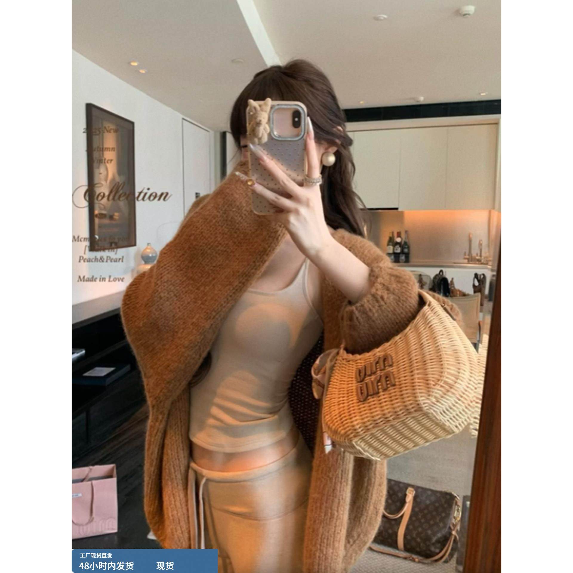 棕色覆古马海毛毛衣外套女秋冬松弛感慵懒宽松针织开衫中长款上衣