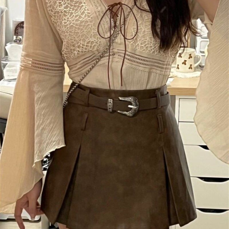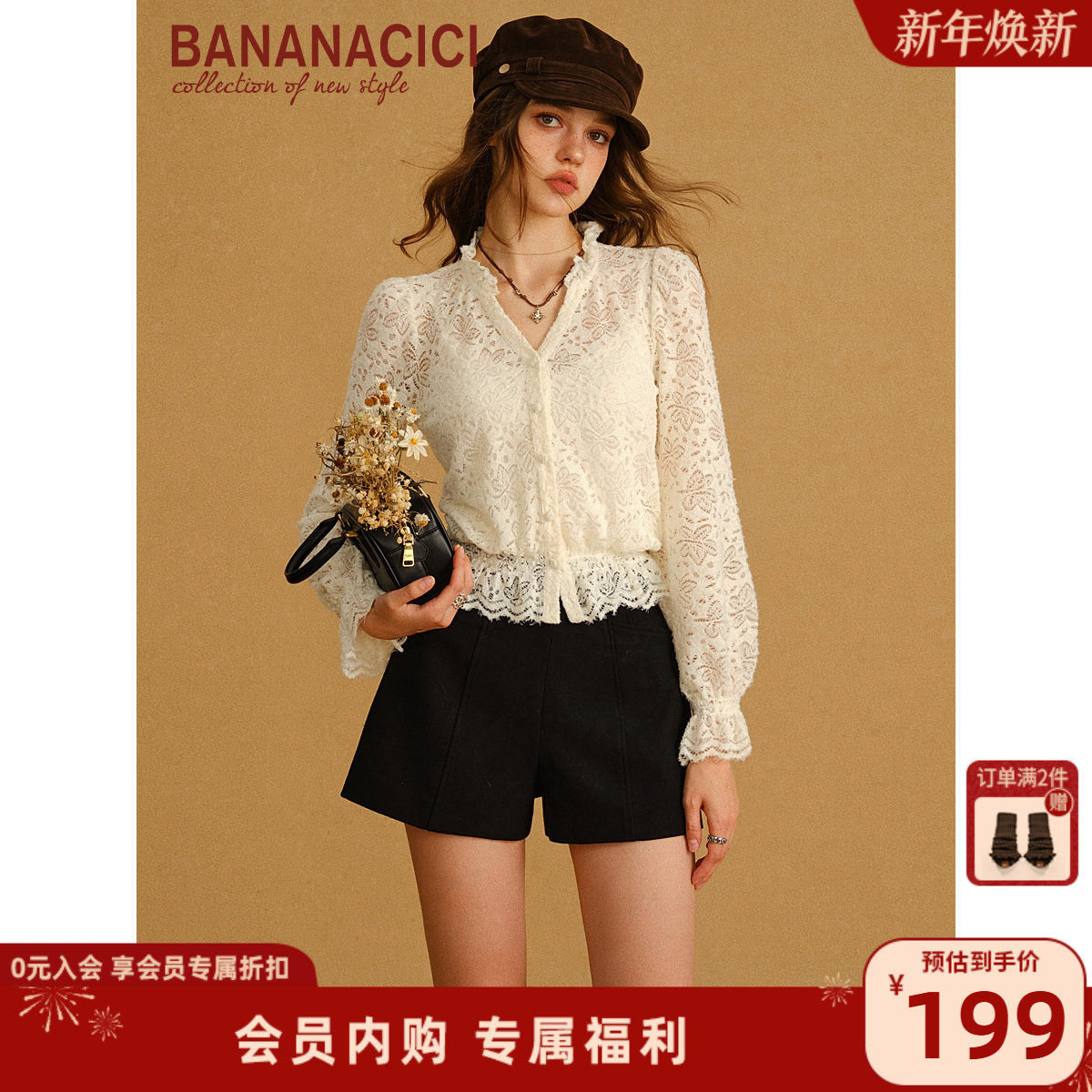 BANANA CICI2025年冬季新款喇叭袖V领木耳边含内搭衬衫蕾丝上衣