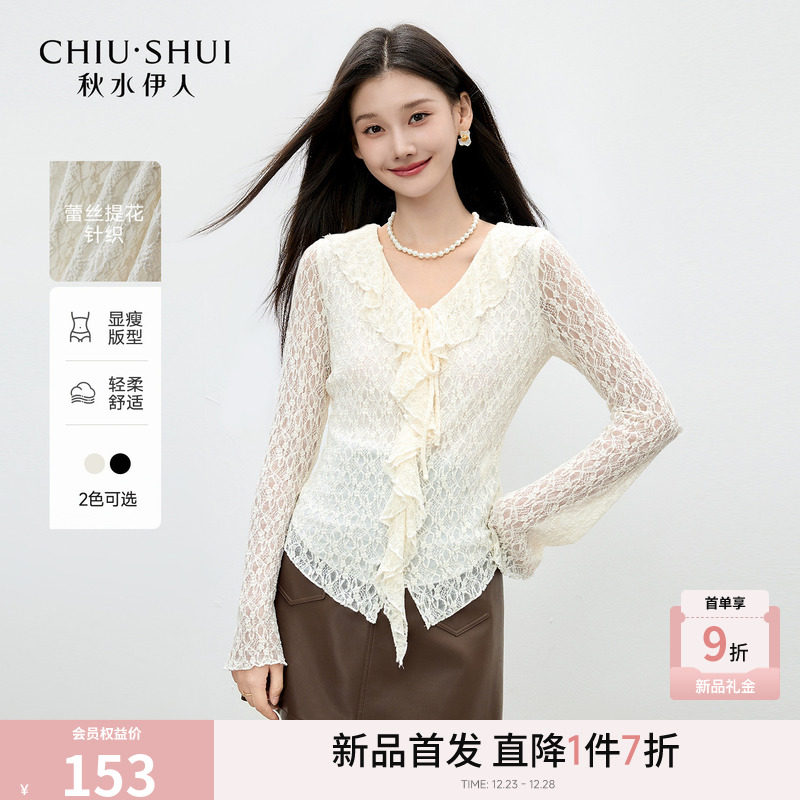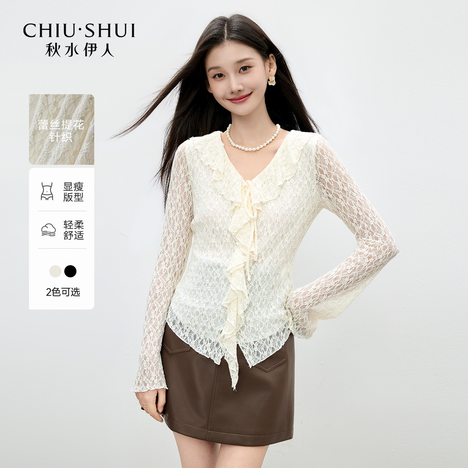 秋水伊人优雅气质V领喇叭袖上衣2026年春季新款荷叶边设计蕾丝衫