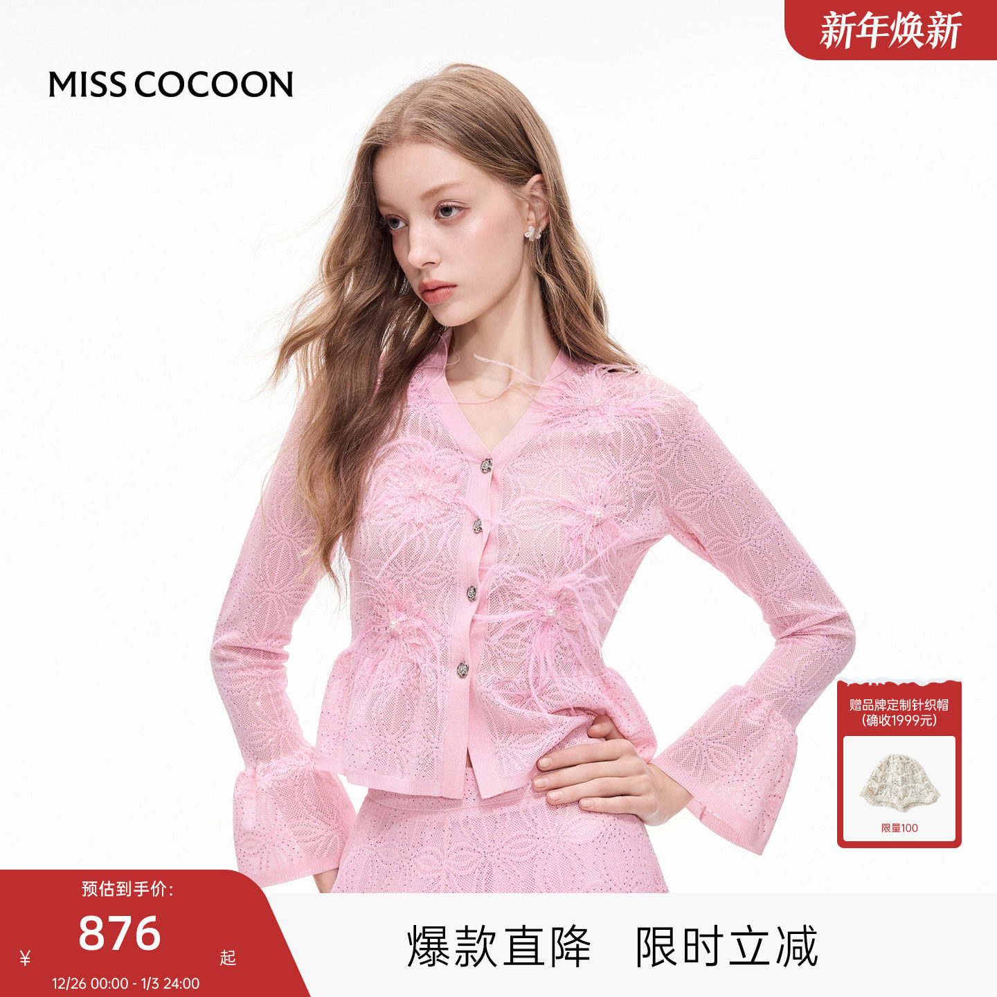 MISSCOCOON可可尼薄款粉色针织开衫女2025秋季新款V领喇叭袖上衣