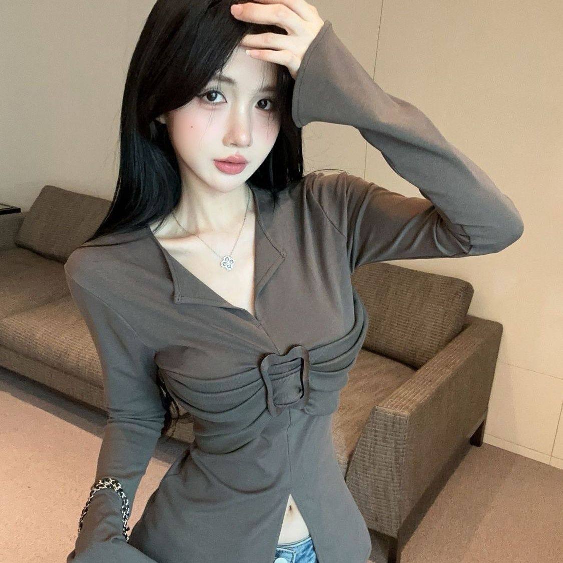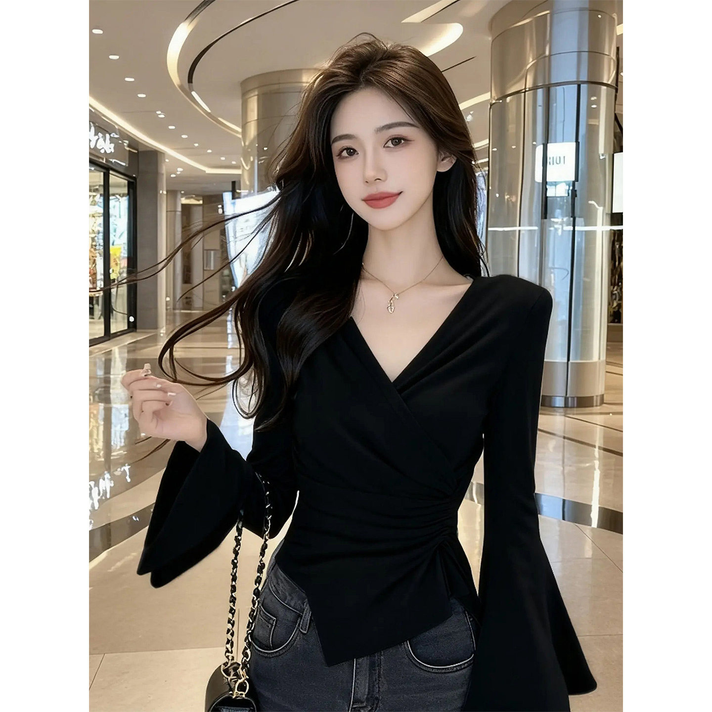 性感纯欲风V领喇叭袖上衣女秋冬新款设计感辣妹不规则下摆显瘦T恤
