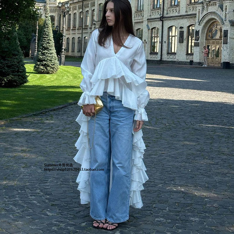 小众设计感荷叶边拖地下摆衬衫V领喇叭袖上衣 Floor-length shirt