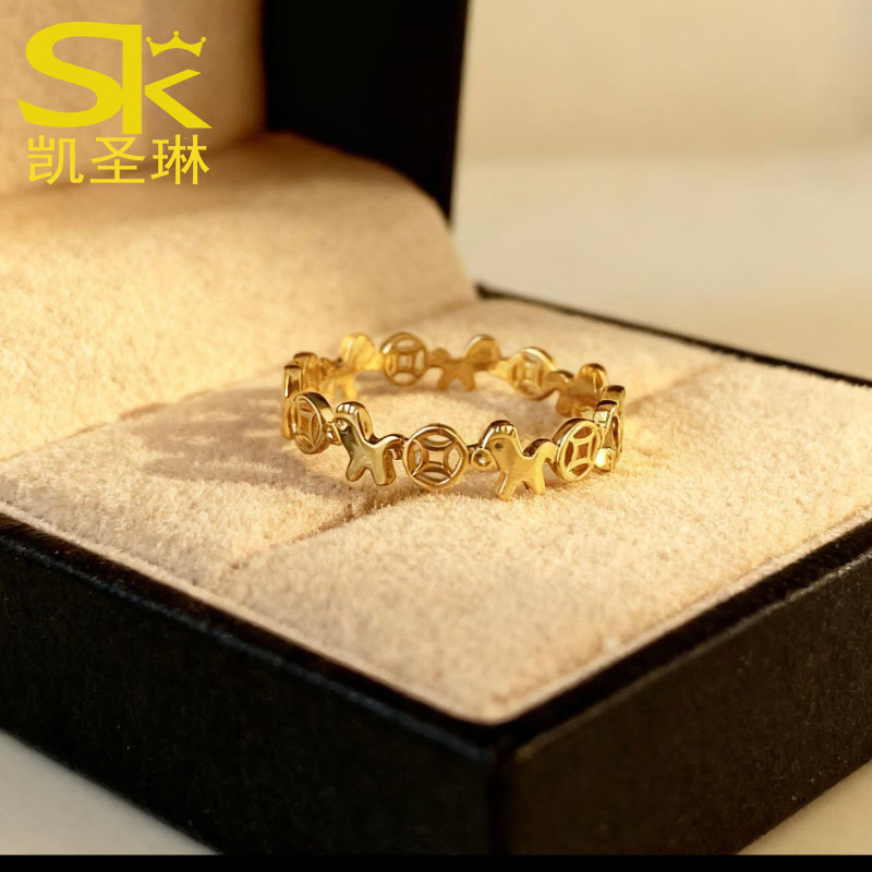 正品纯金戒指999足金24k黄金轻奢小马铜钱开口金包银戒指女可调节