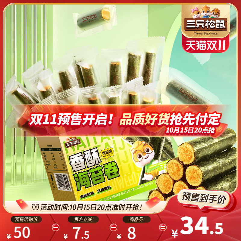 【双11预售】三只松鼠肉松海苔卷约180根夹心海苔日常休闲零食