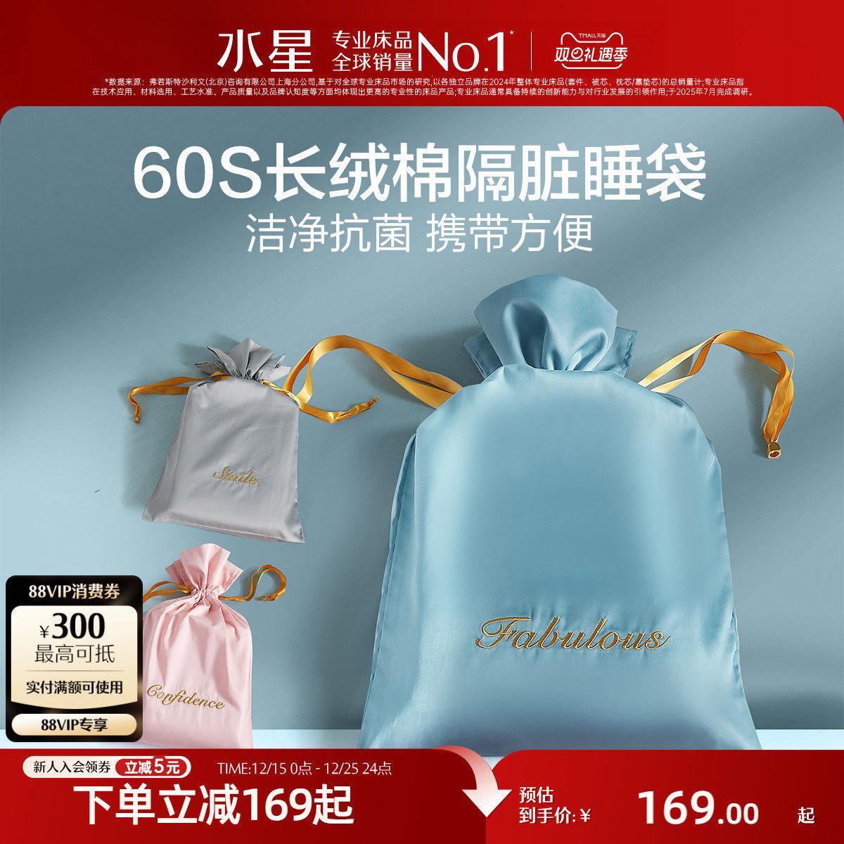 水星家纺60支长绒棉全棉抗菌酒店隔脏睡袋出差旅行床单被套便携式