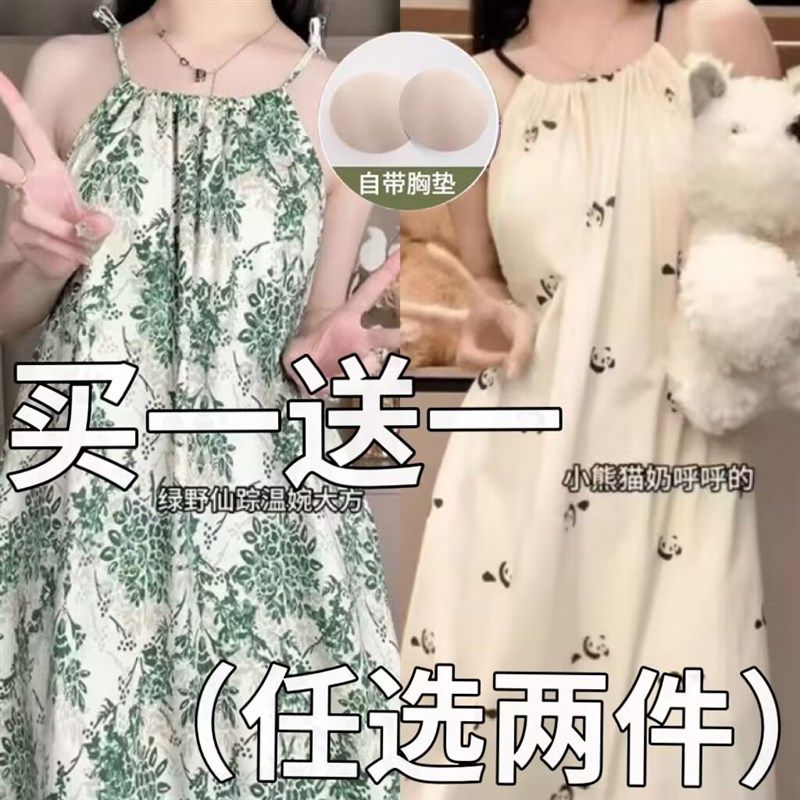 睡裙女夏季100%纯棉中长款带胸垫2025新款睡衣女吊带连衣裙家居服