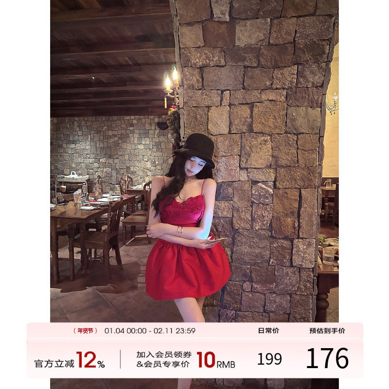 项天鹅er 红色吊带连衣裙女2025冬季新款高级感a字裙新年战袍裙子