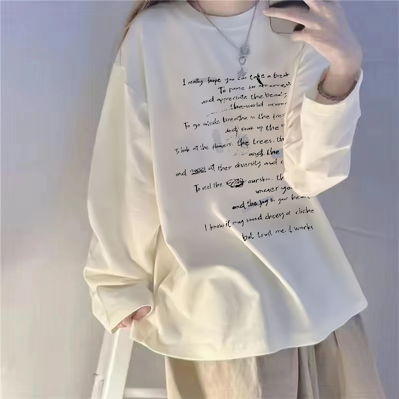 十一石 松弛入冬 小众印花白色圆领长袖t恤女小个子宽松打底衫ll