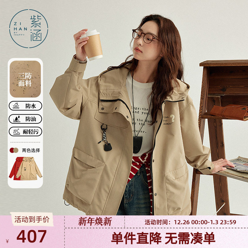 紫涵工装大口袋连帽外套女春秋季新款宽松休闲通勤防风流行短风衣