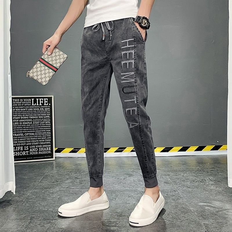 精神小伙裤子男松紧腰小脚休闲牛仔裤弹力束脚裤男九分裤潮流男裤
