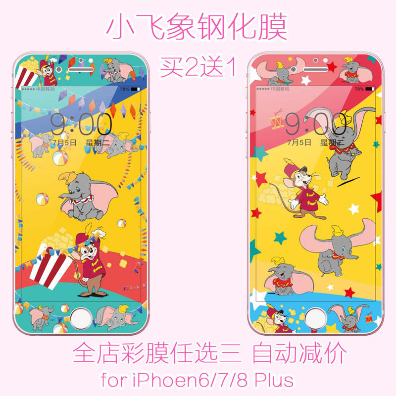 小飞象适用苹果7plus钢化膜卡通可爱8p全屏软边iphone8彩膜6s贴膜