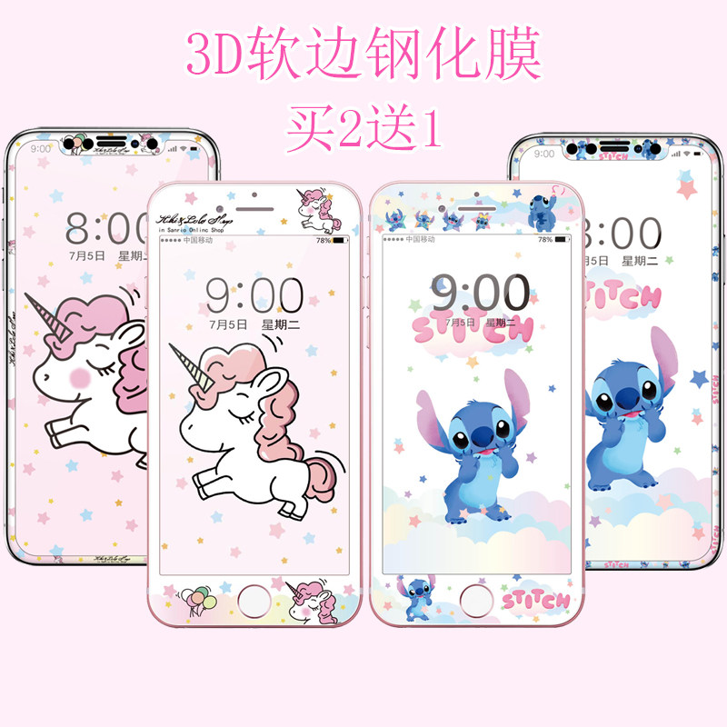 新款可爱卡通适用苹果6s/7/8卡通钢化玻璃贴膜iPhone7/8plus全屏彩色软边前膜SE1/2/3女款4/5S潮女四五6plus