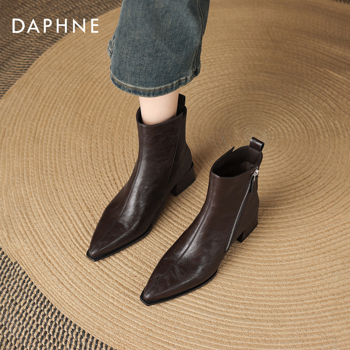 达芙妮高跟尖头短靴女2026新款秋冬加绒棕色皮靴法式瘦瘦靴马丁靴