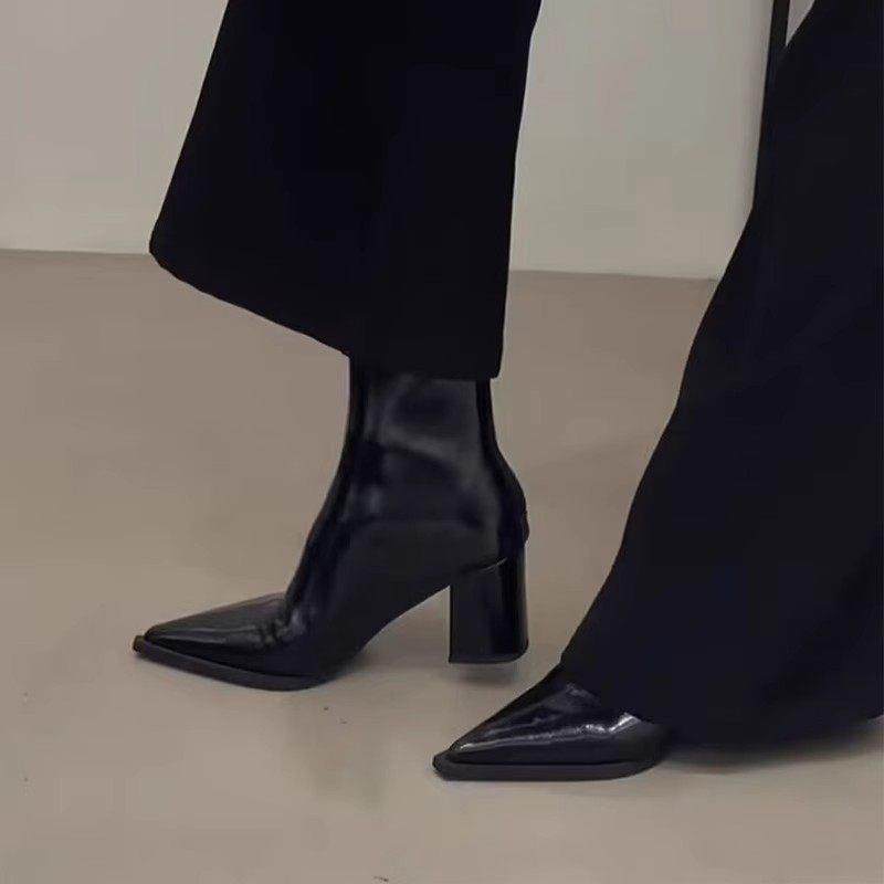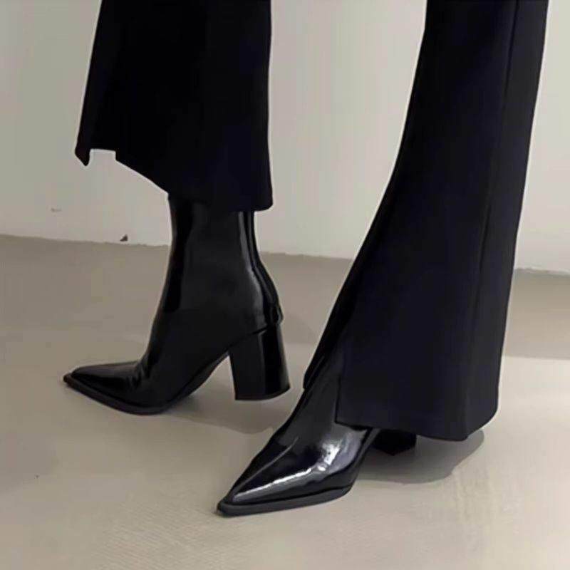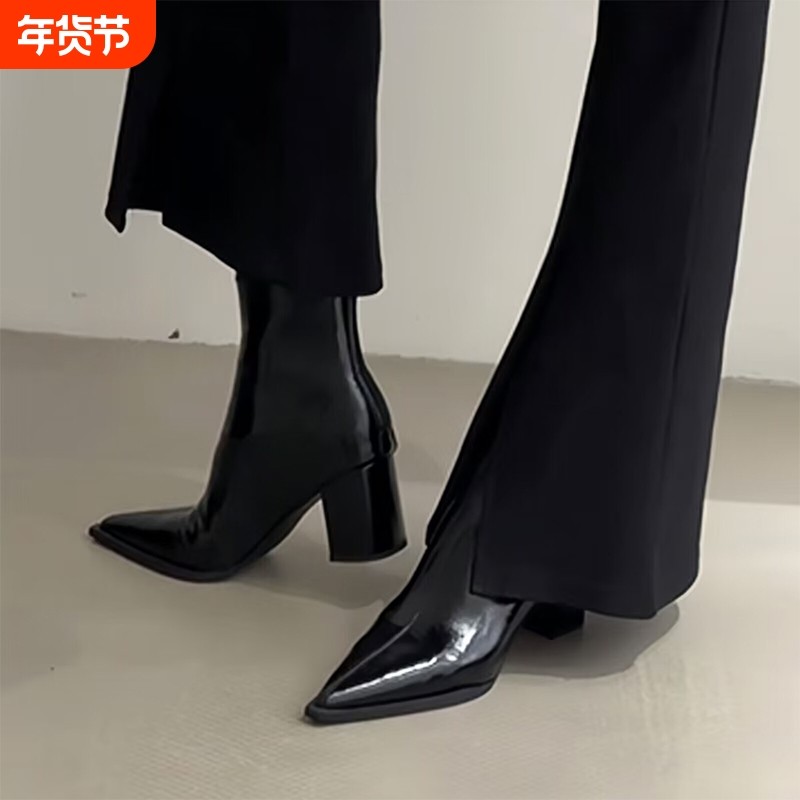 高跟尖头短靴女粗跟后拉链2025年新款秋冬季黑色漆皮高级感马丁靴