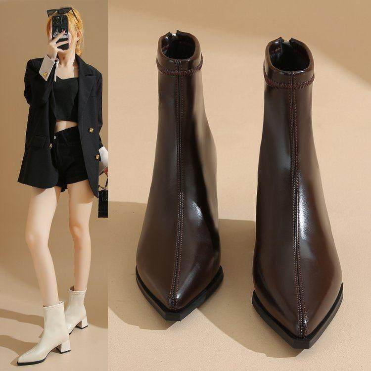高跟尖头短靴女粗跟后拉链2025年新款秋冬季棕色漆皮高级感马丁靴