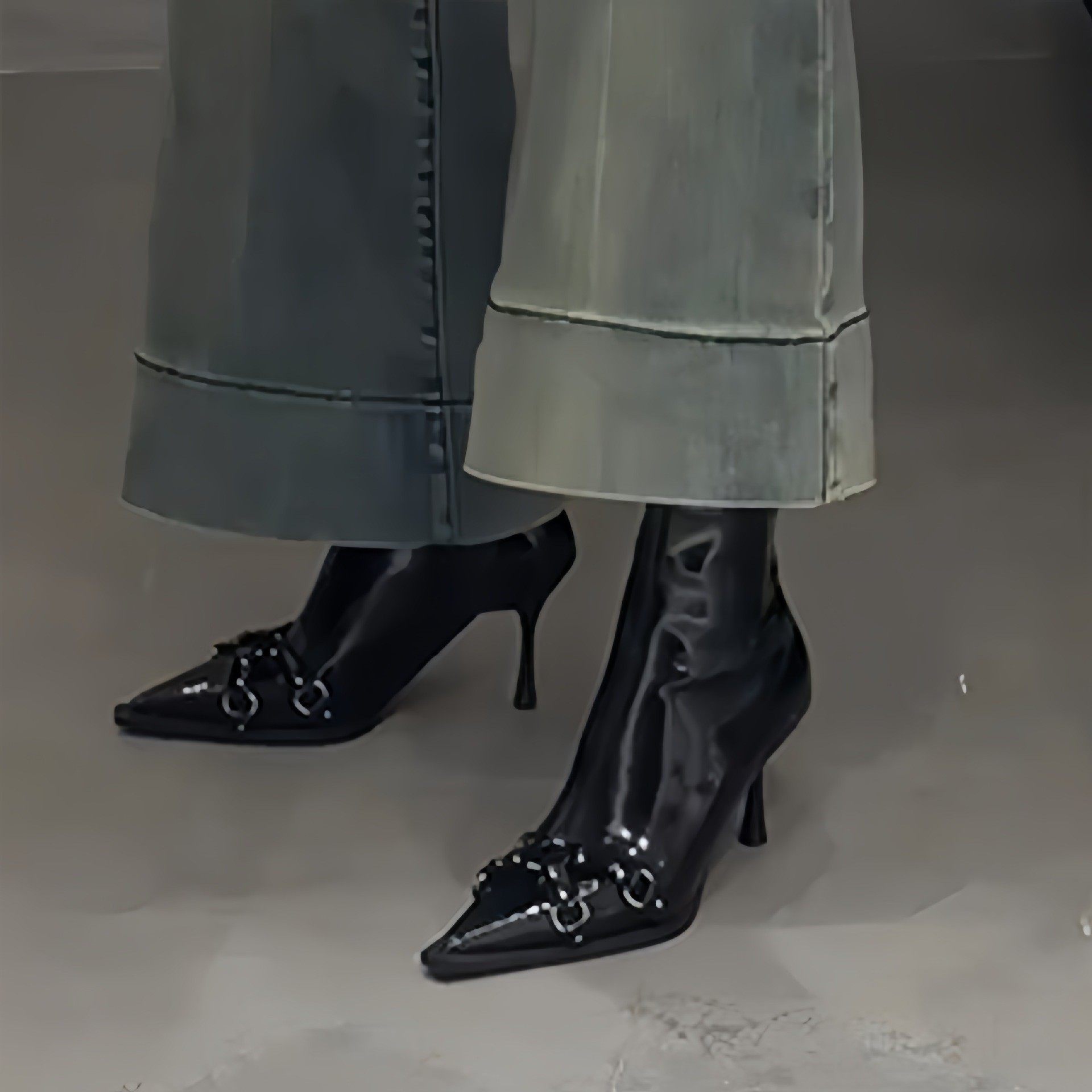 高跟尖头短靴女细跟侧拉链2024年新款秋冬季黑色漆皮感瘦瘦靴