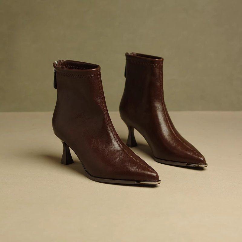 法式真皮绝美高跟尖头短靴女侧拉链锥形跟2025年秋冬时尚百搭短靴