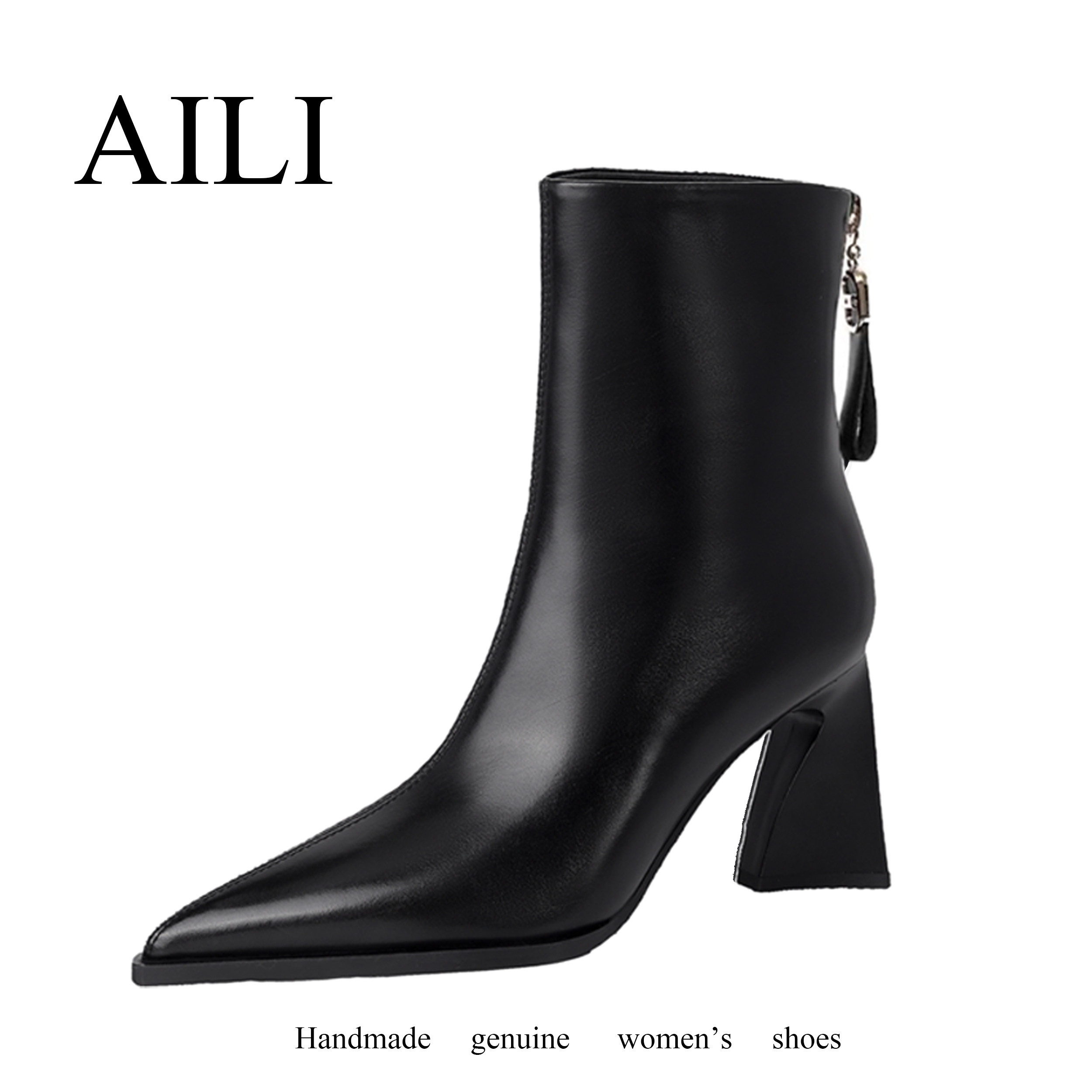 AILI 法式高跟尖头短靴女25年新款超火气质长筒S拉链瘦瘦靴粗跟