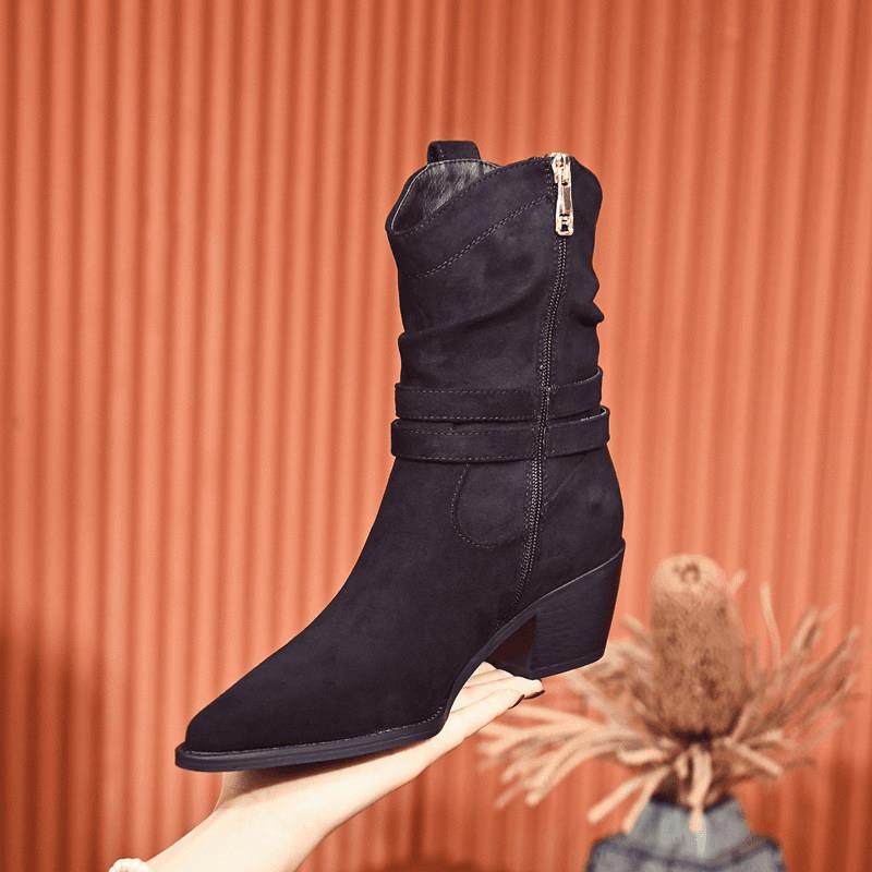 春季高跟尖头短靴女2026冬季新款复古皮带扣西部牛仔靴V口堆0122u