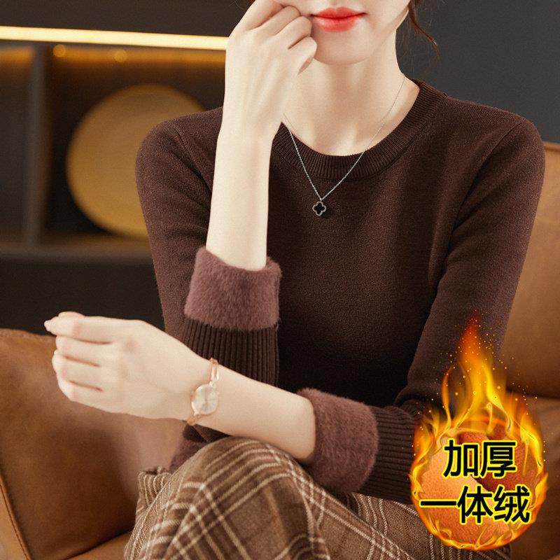 秋冬圆领毛衣女加绒加厚一体绒打底衫内搭保暖上衣修身套头针织衫