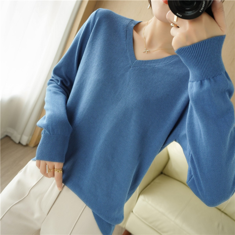 新款100%纯棉V领长袖针织女百搭休闲宽松打底纯棉线上衣修身套头