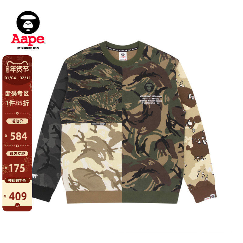 Aape旗舰店男装春秋潮流章字母印花多色迷彩拼接圆领卫衣3874XAI