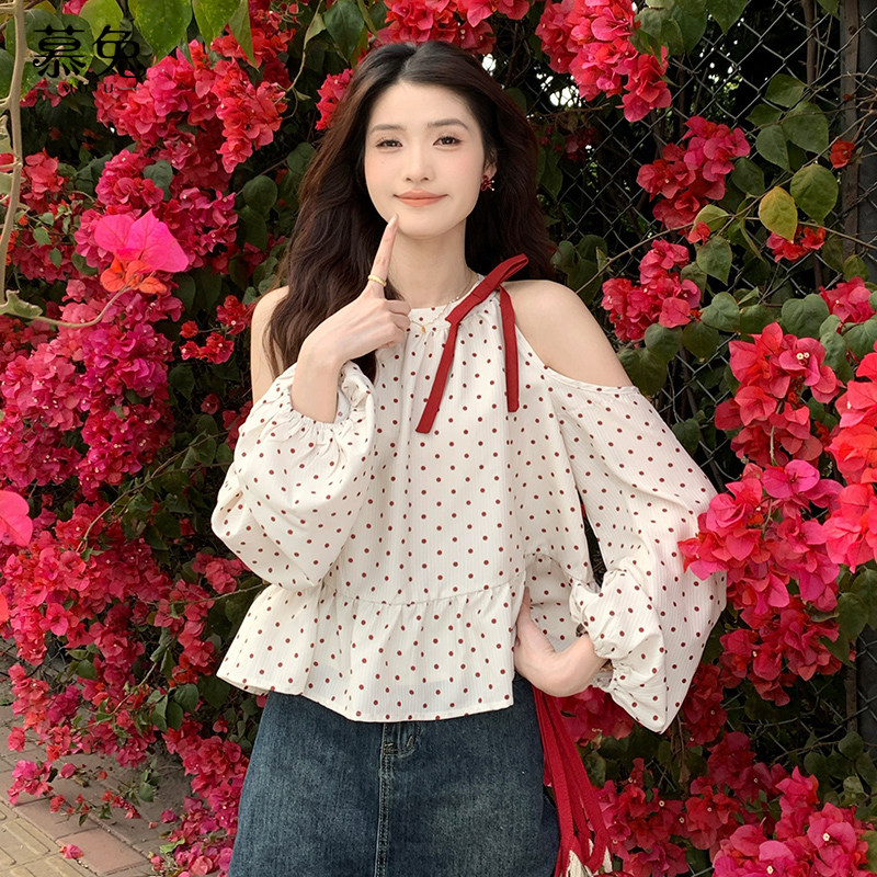 慕兔法式挂脖露肩长袖衬衫女2025秋季新款设计感小众宽松波点上衣
