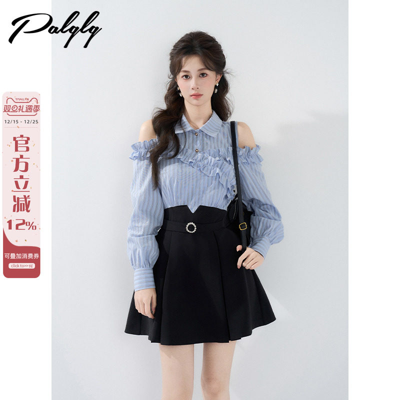 Le 19 RomanLand 一字肩上衣荷叶边露肩长袖衬衫女显瘦百褶裙套装