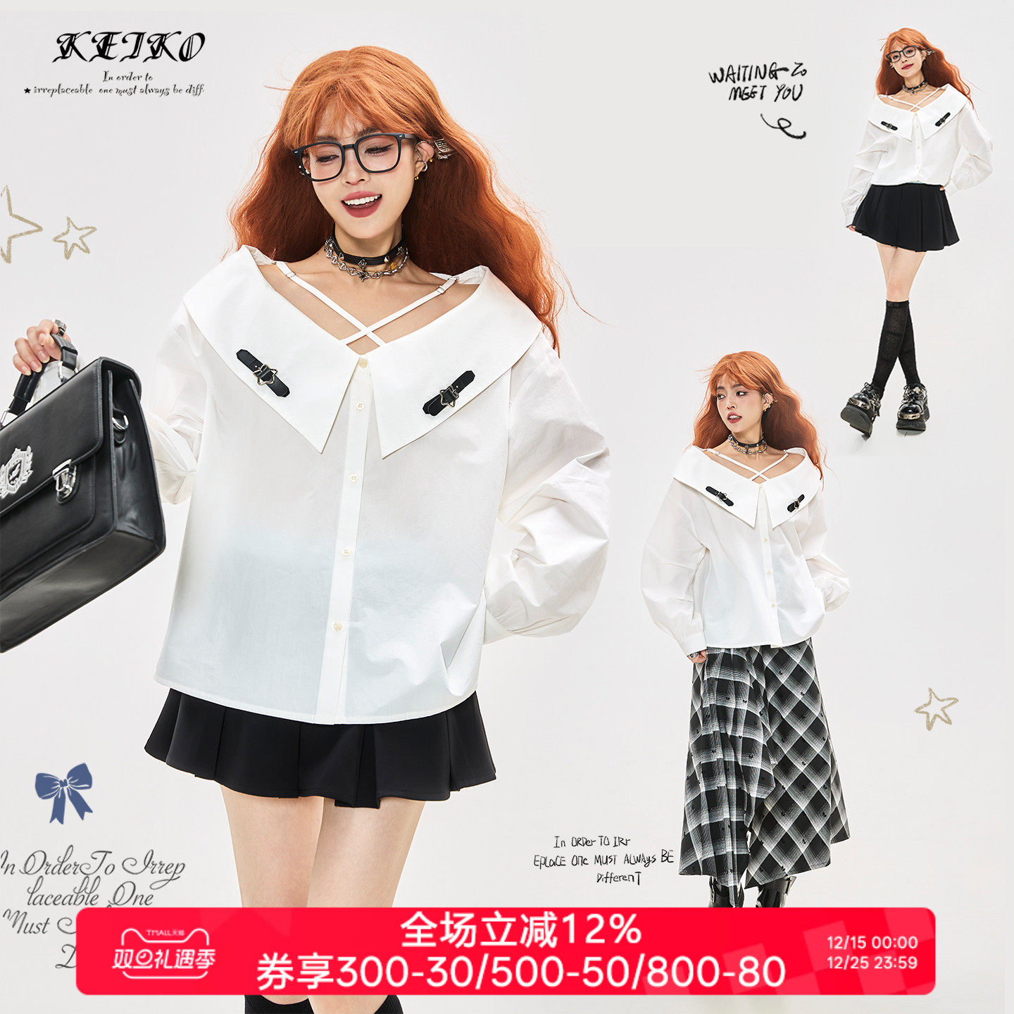 KEIKO 法式一字翻领长袖衬衫女2026春季设计感白色灯笼袖露肩上衣