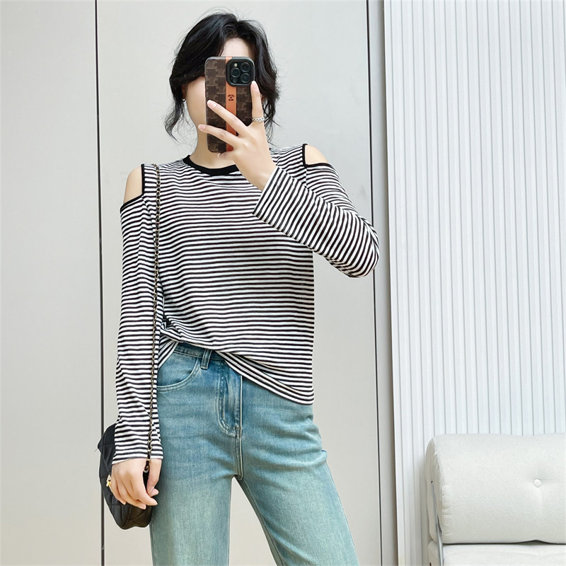 惠衣阁秋季女棉质长袖条纹t恤衫露肩上衣休闲甜美条纹T恤打底上衣