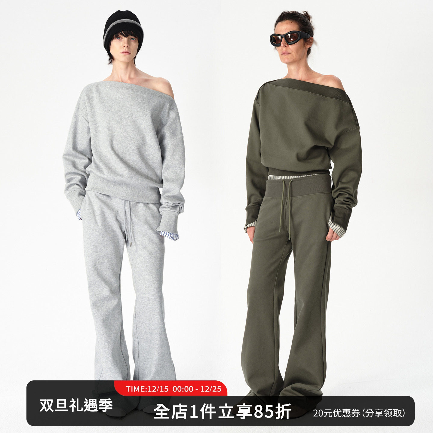 SMIIILE斜肩露肩宽松灰色卫衣女休闲条纹拼接衬衫袖套头长袖上衣