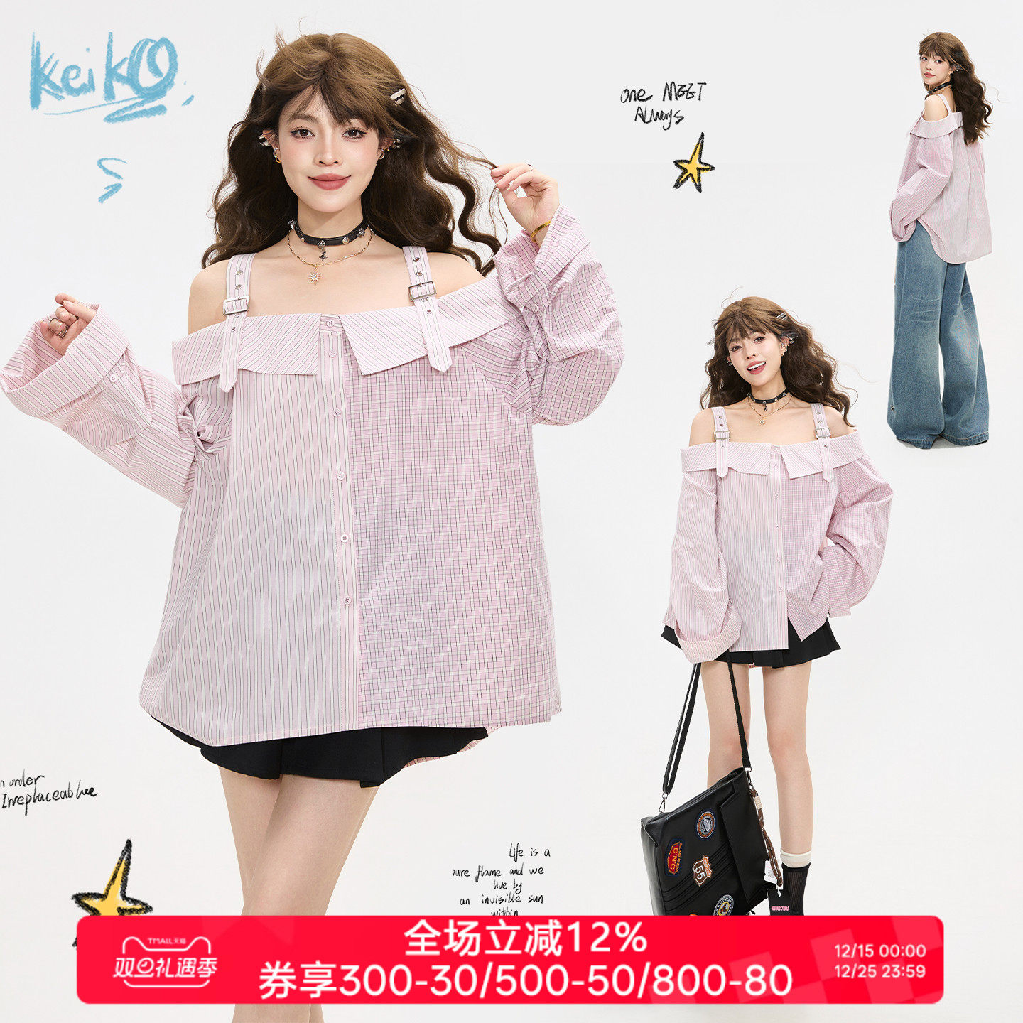 KEIKO 樱花粉一字领露肩长袖衬衫女26春季新款露锁骨条纹吊带上衣