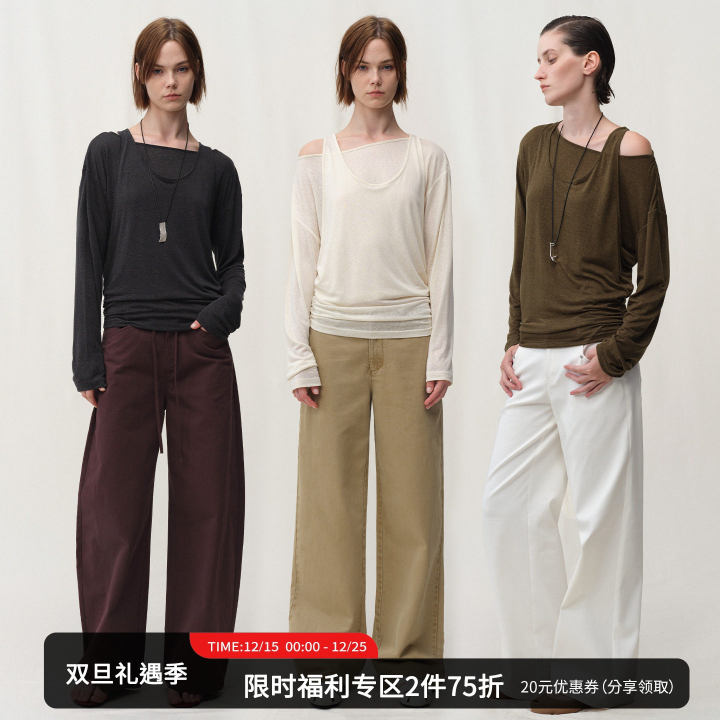 SMIIILE假两件天丝亚麻斜肩露肩亲肤上衣女秋褶皱堆叠感长袖t恤衫