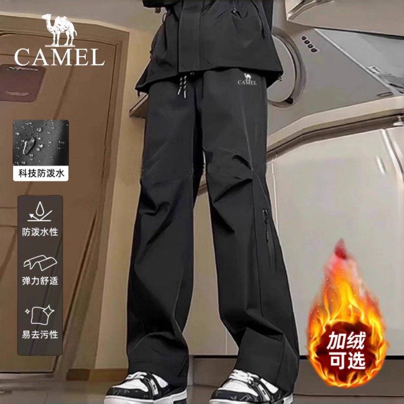 骆驼冲锋裤男2025新款秋冬季男宽松工装户外登山运动休闲黑色裤子