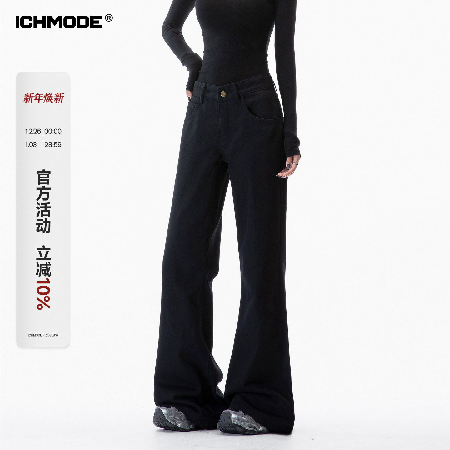 ICHMODE 美式微喇休闲裤女慵懒风直筒修身阔腿裤加厚加绒黑色裤子